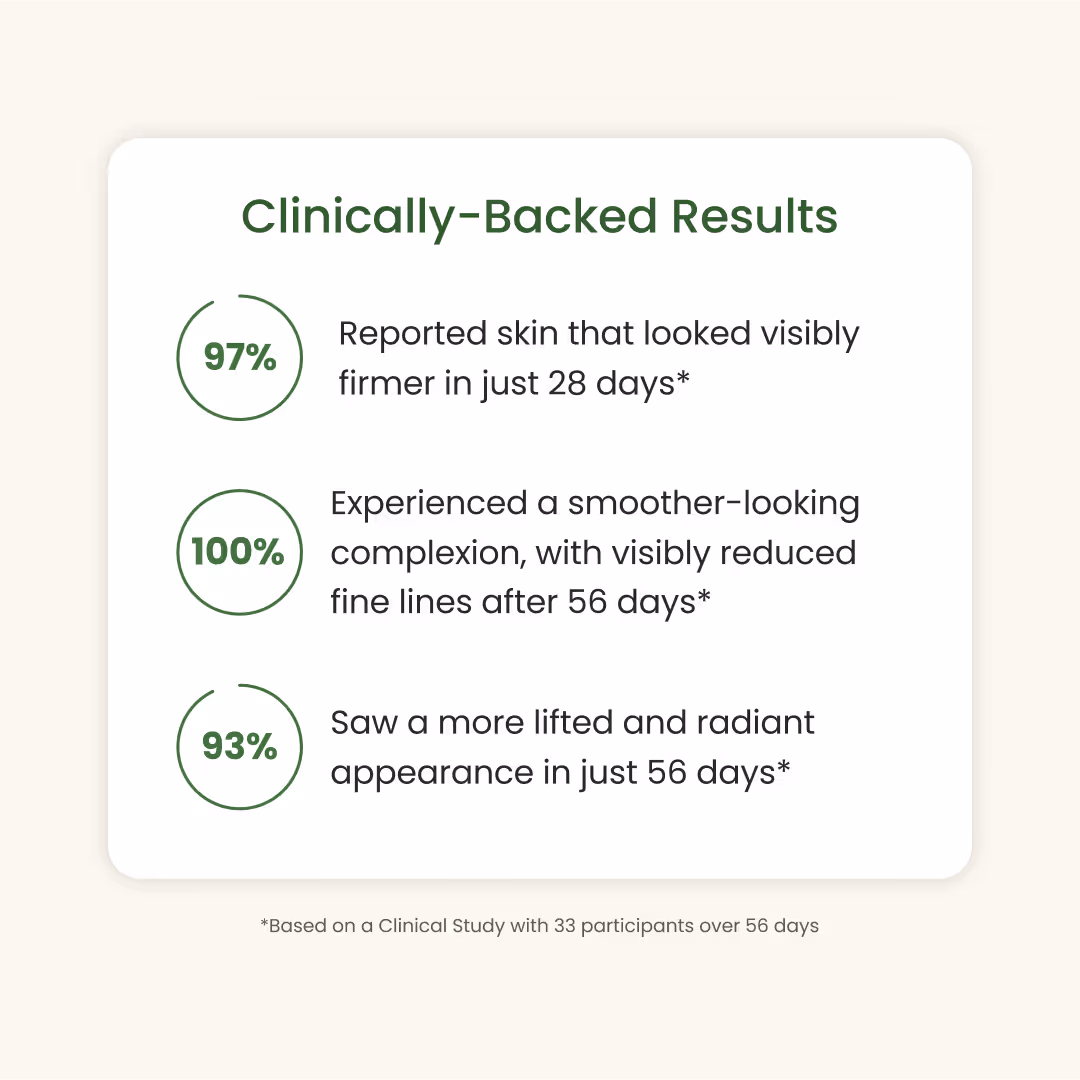 Most of our customers notice an instant tightening-like effect on their skin. Many women report smoother skin within 3 to 7 days. While minimizing the appearance of signs of premature aging, most women see results within 4 to 6 weeks.